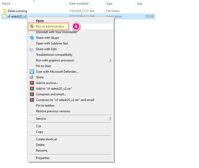 - Chạy xf-adesk20_v2 với Run as administrator.