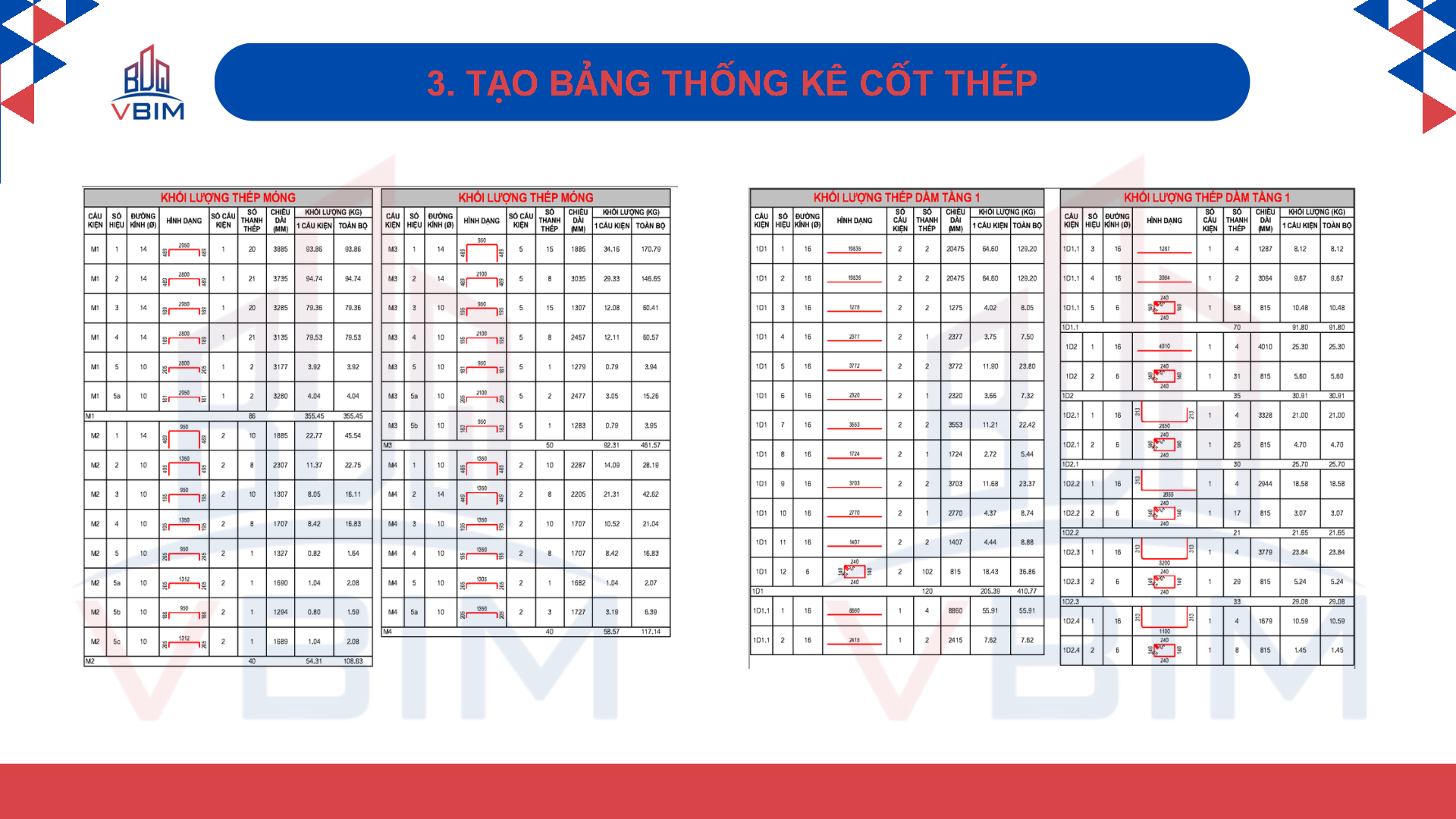 ✓ Tạo bảng thống kế Cốt thép cho Móng – Cột – Dầm – Sàn – Cầu thang