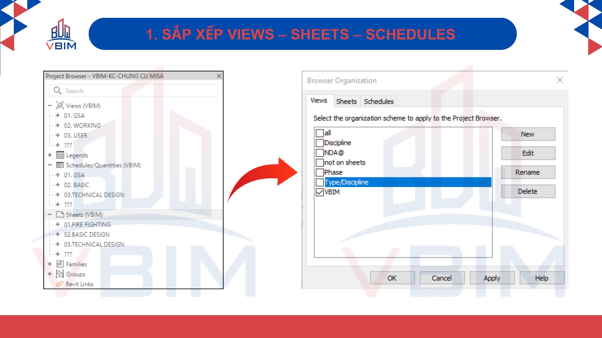 ✓ Sắp xếp Views – Sheets – Schedules trong thanh công cụ Project Browser