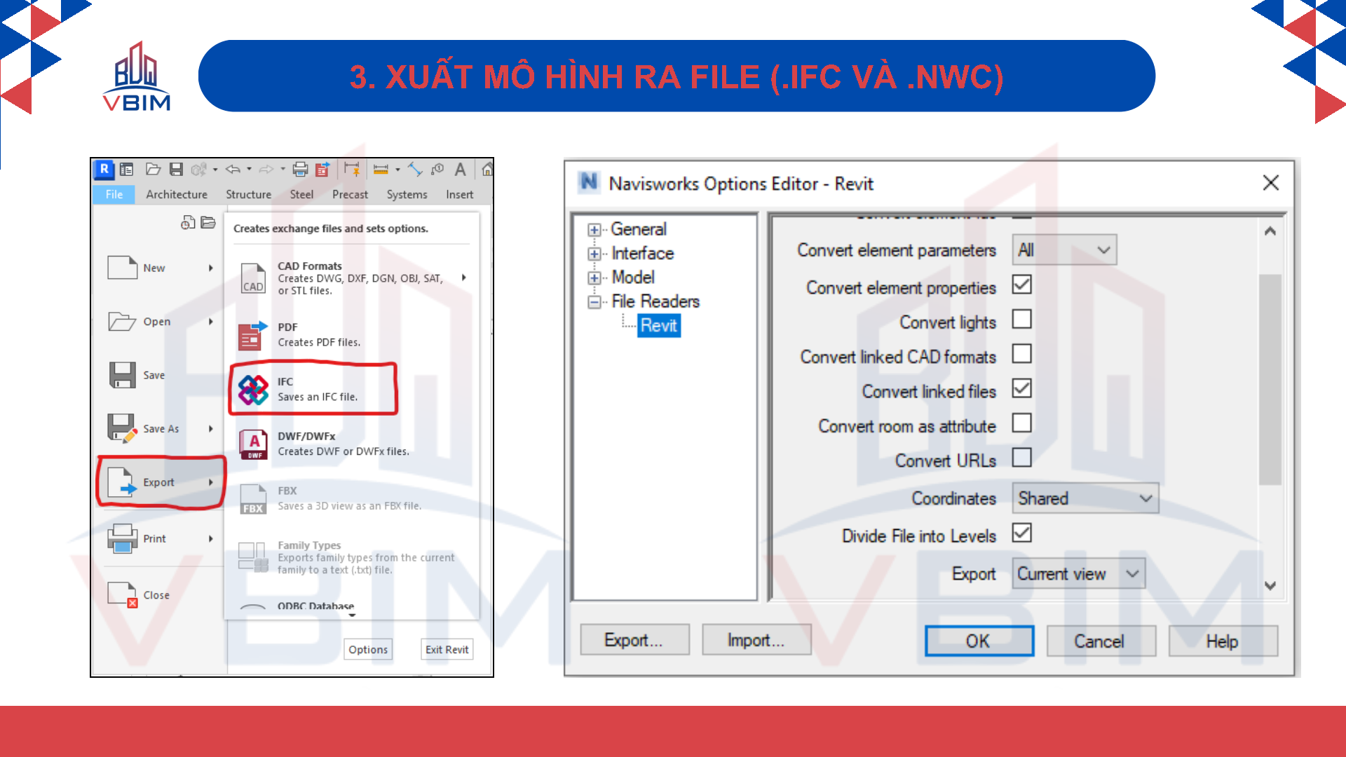 ✓ Xuất mô hình ra file .IFC, .NWC,….